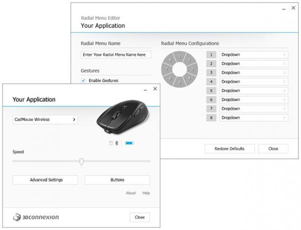 For even more convenience you can create and bind custom radial menus with up to 8 keys/commands/macros each. When you press a button the assigned radial menu will appear so you can click on, or gesture toward, the required function with your mouse. By using radial menus even a regular SpaceMouse and CadMouse, that have less buttons than the others, can give you quick access to numerous functions.