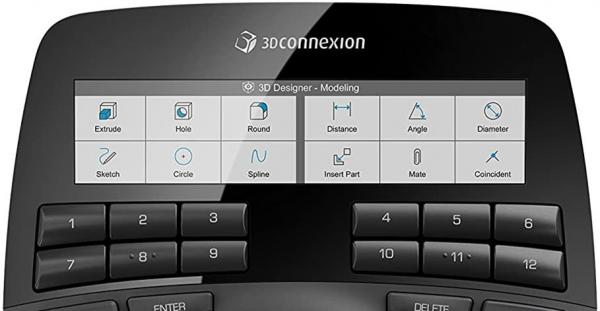 The 3DxWare 10 software gives you the power to customize the cap operation and sensitivity. Each SpaceMouse Enterprise also has 31 programmable buttons that are conveniently placed for easy access. The first are a set of 12 buttons at the top that are intelligent enough to change as you switch applications, and can have their assigned commands displayed on the screen above. You can bind a variety of things to any button, from single keys or commands, to customized macros containing multiple inputs. For full flexibility you can create and bind custom radial menus with up to 8 keys/commands/macros each. When you press a button the assigned radial menu will appear so you can click on, or gesture toward, the required function with your mouse.